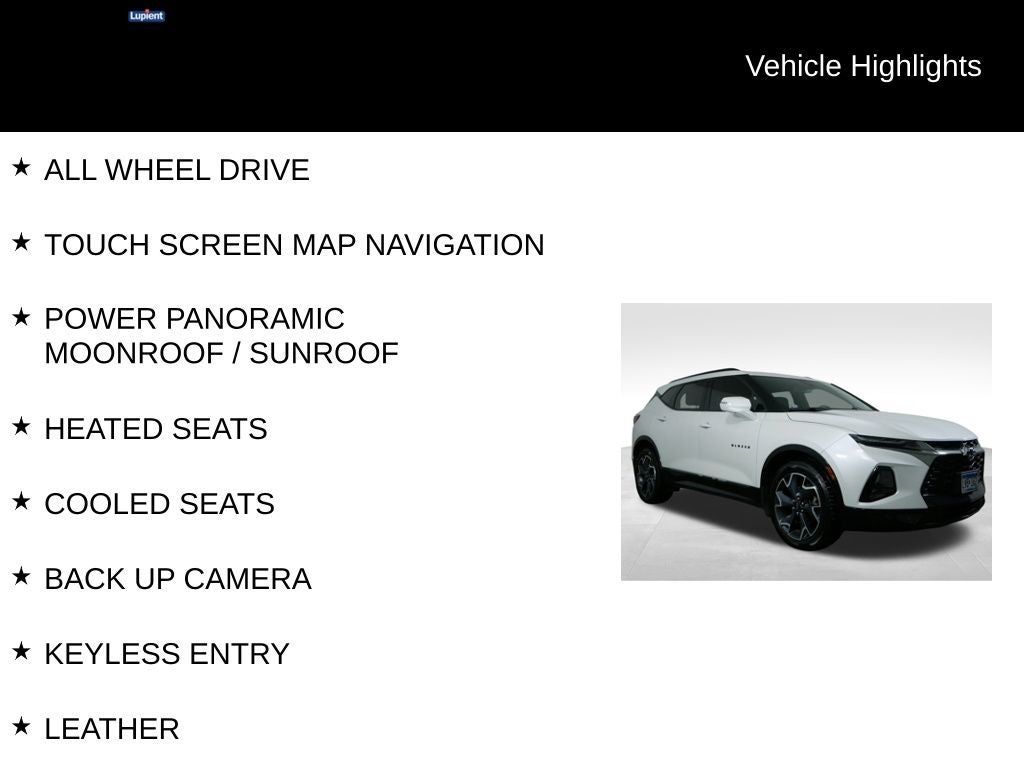 Boasting a striking White exterior, the Blazer RS commands attention with its bold presence. Equipped with a powerful 3.6L V6 engine and All-Wheel Drive, this SUV delivers a thrilling and confident ride, whether navigating city streets or taking on the open road. Impressive fuel efficiency, with 19 MPG in the city and 26 MPG on the highway, ensures you can go further without compromising on power.